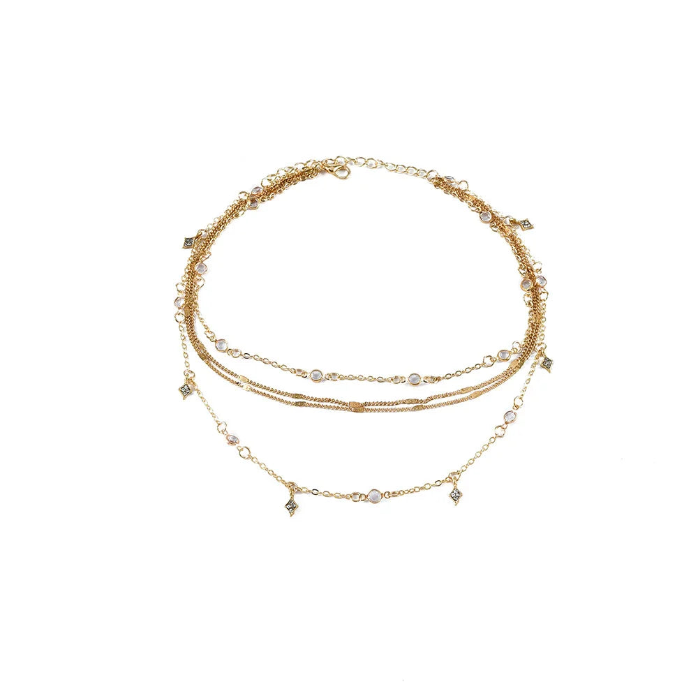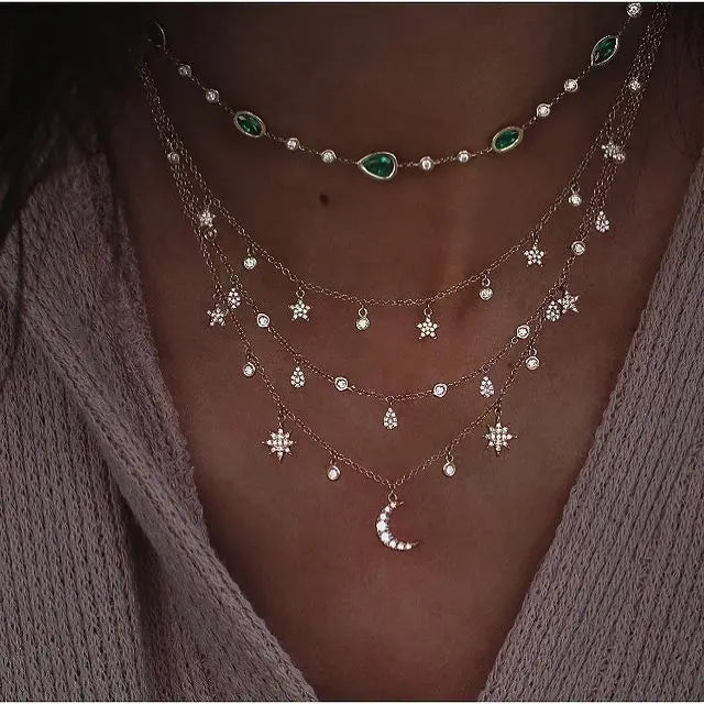 Tämä upea kultainen kristallitähti-kaulakoru yhdistää boheemi-tyylin, vintage-eleganssin ja modernin glamourin. Monikerroksinen muotoilu ja kimaltavat kristallitähdet luovat romanttisen ja hienostuneen ilmeen, joka sopii täydellisesti sekä arkeen että juhlaan.