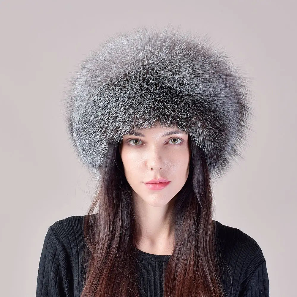 Women's genuine fox fur hat with earflaps, thick luxury winter hat