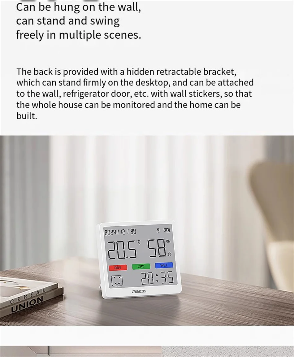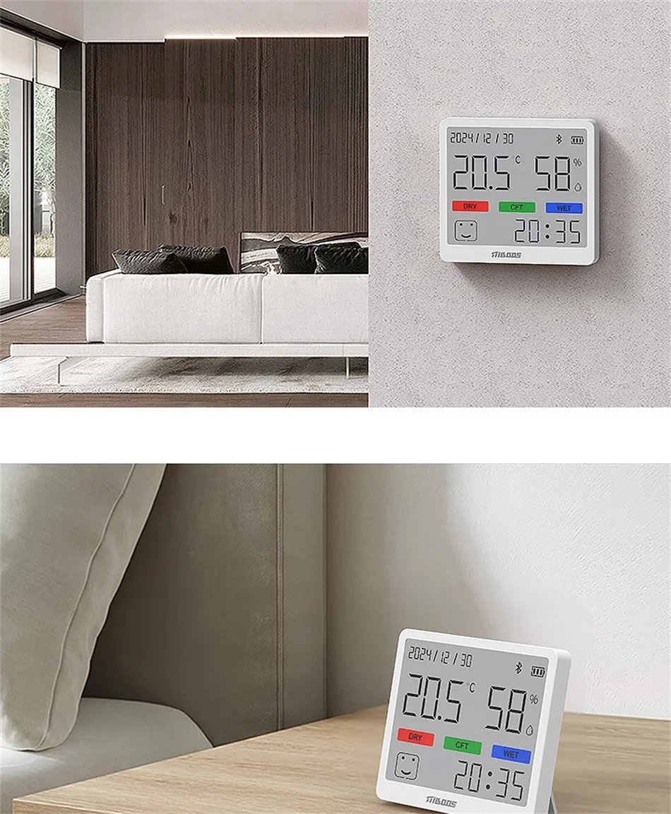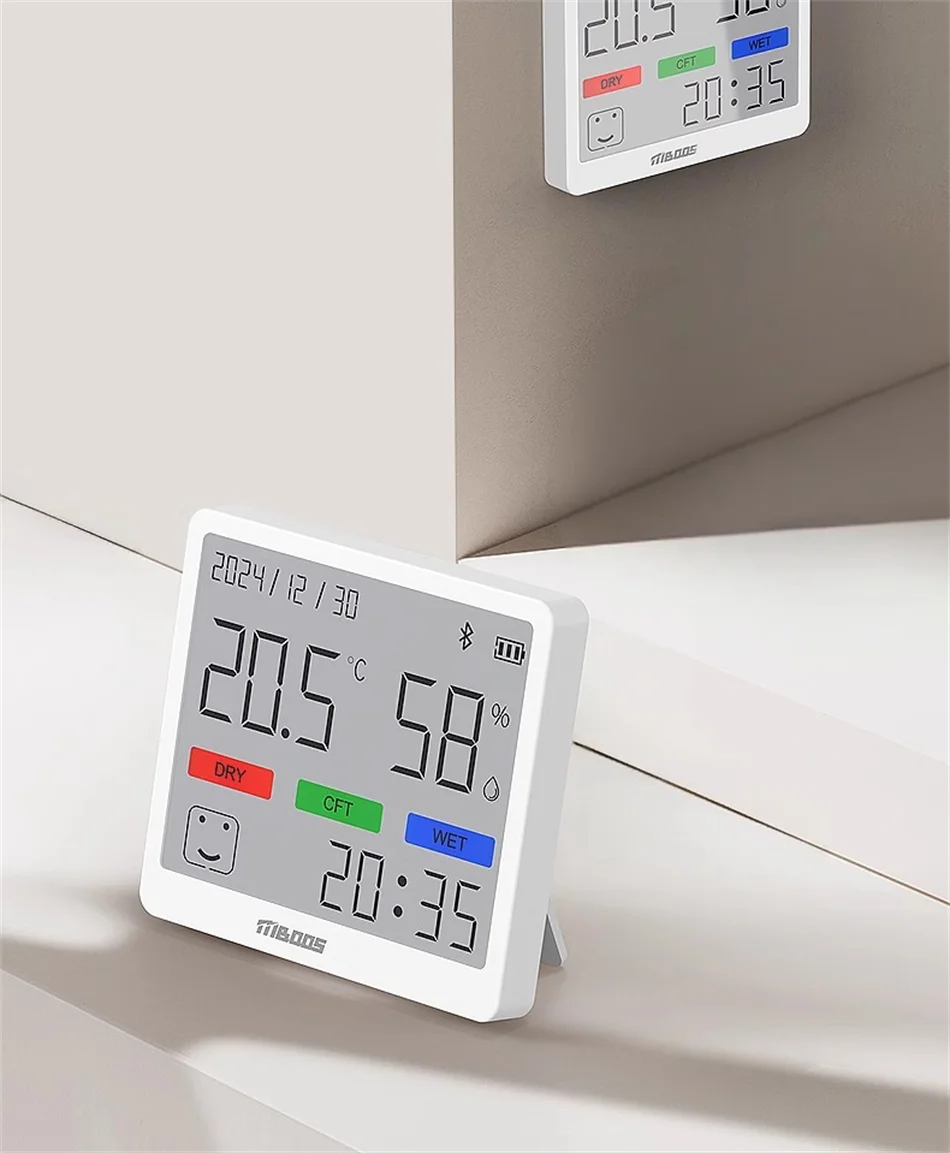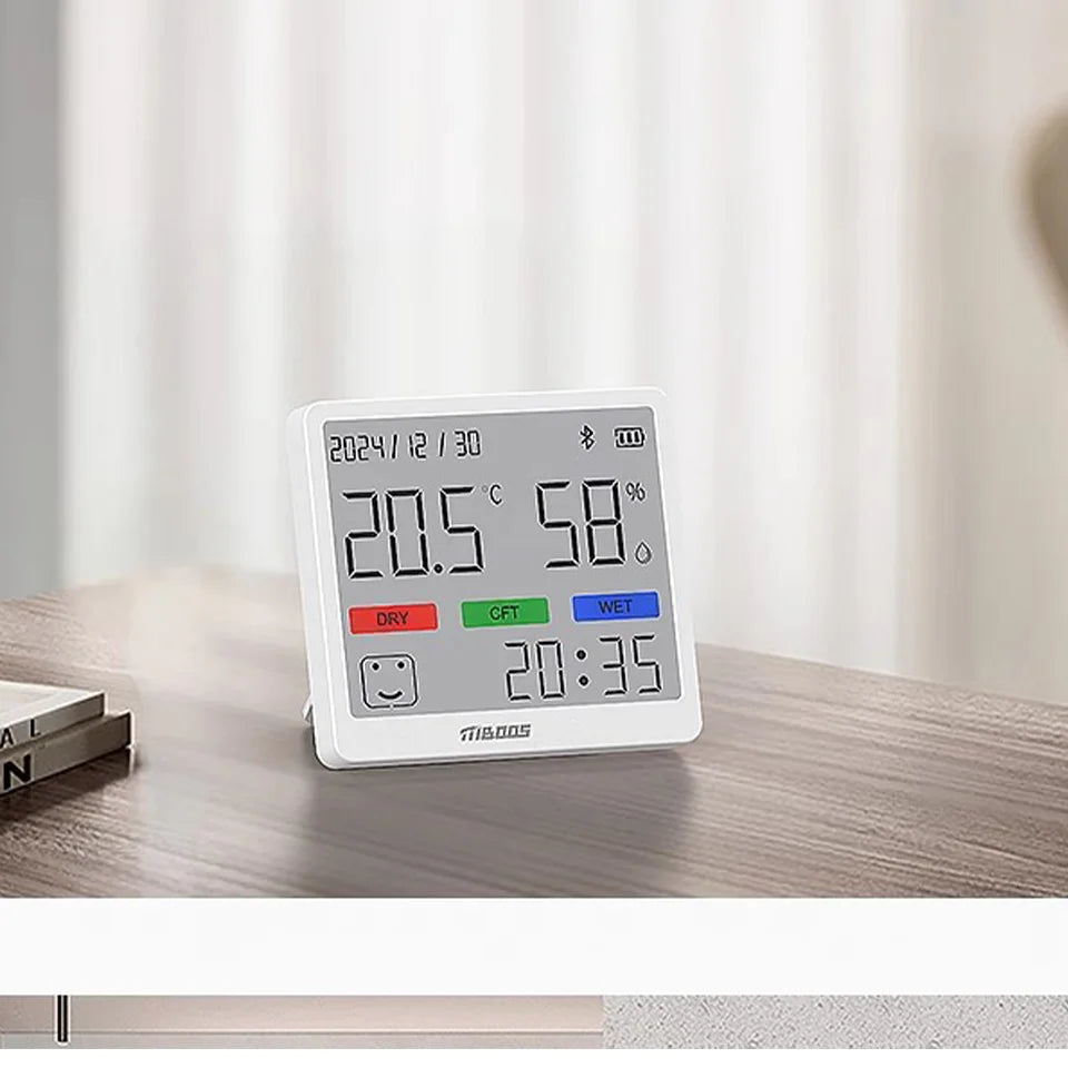 Selkeä LCD-näyttö esittää lämpötilan, kosteuden ja kellonajan samanaikaisesti. Ei tarvitse katsella useita laitteita – kaikki tärkeä tieto yhdessä paikassa. Täydellinen makuuhuoneeseen, olohuoneeseen, lastenhuoneeseen tai toimistoon.