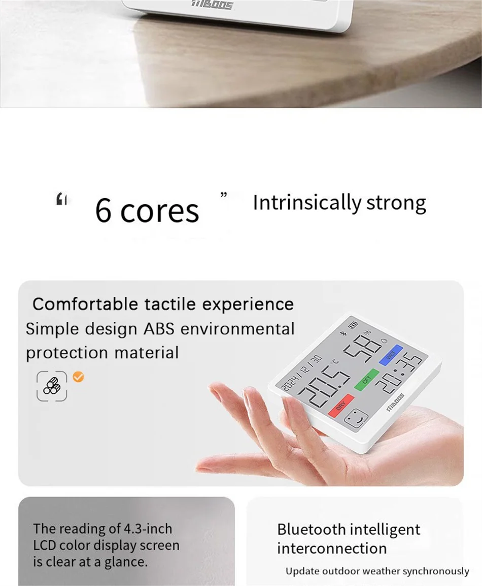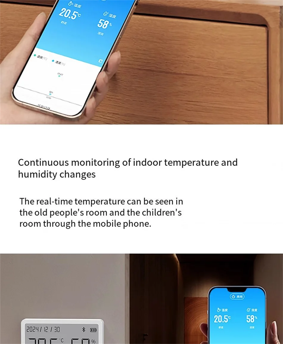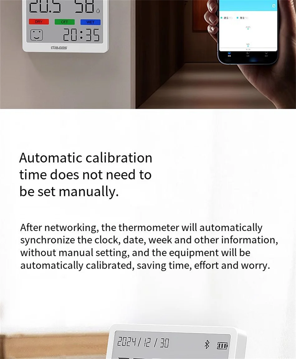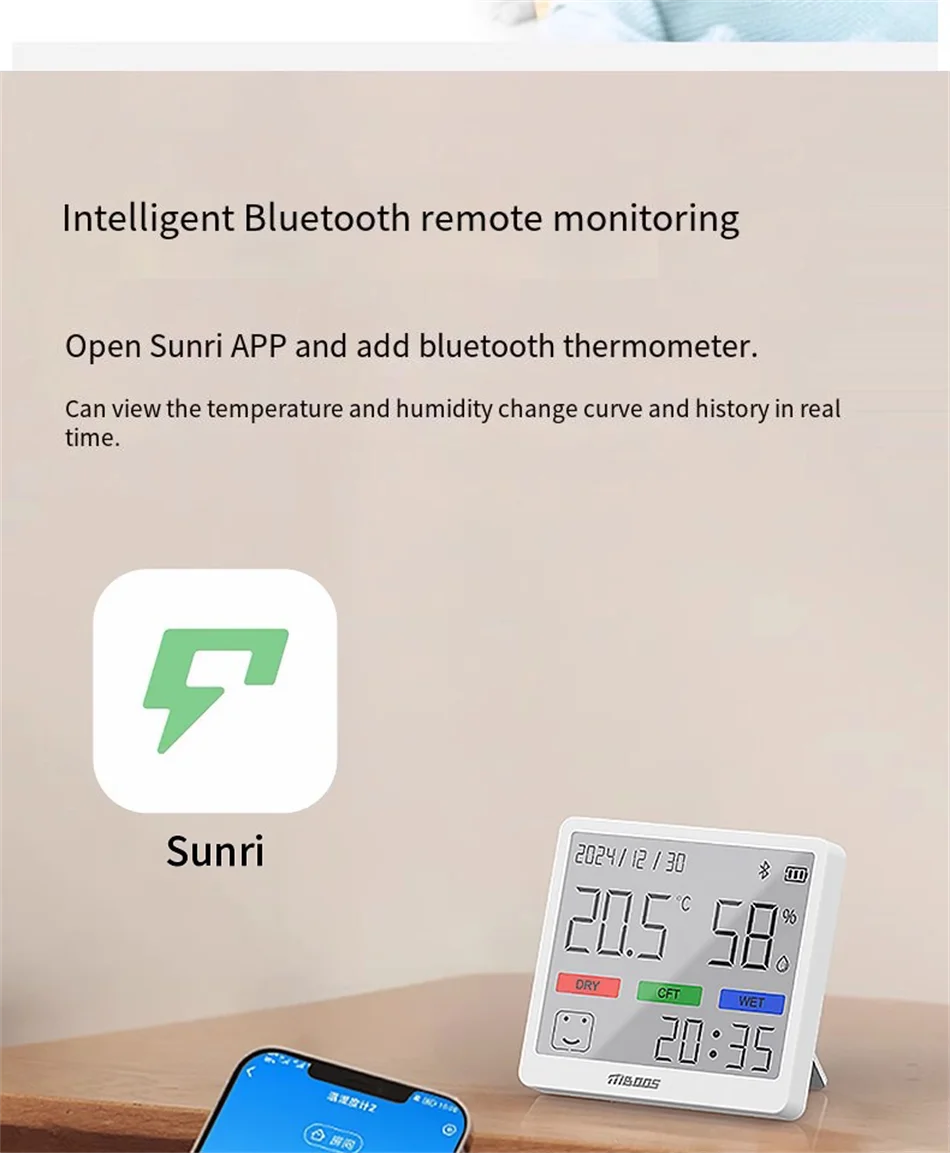 Selkeä LCD-näyttö esittää lämpötilan, kosteuden ja kellonajan samanaikaisesti. Ei tarvitse katsella useita laitteita – kaikki tärkeä tieto yhdessä paikassa. Täydellinen makuuhuoneeseen, olohuoneeseen, lastenhuoneeseen tai toimistoon.