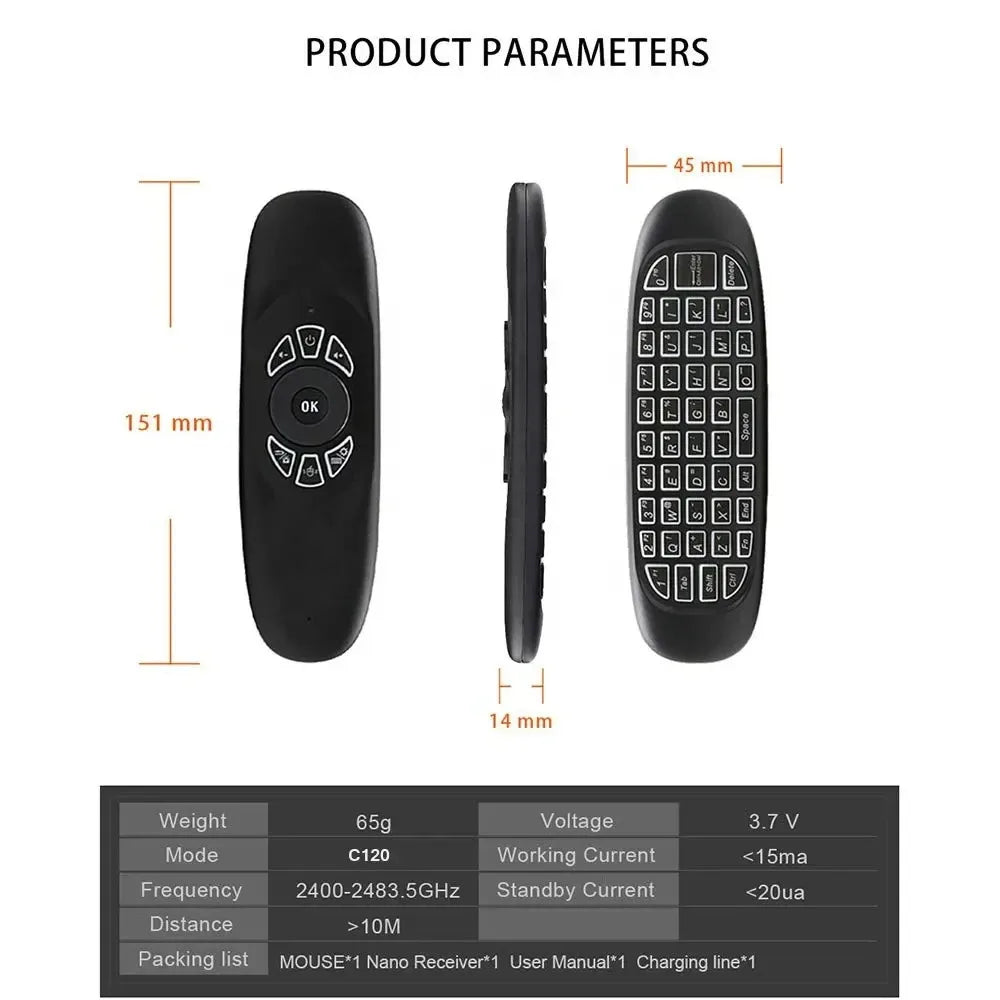 C120 Taustavalaistu Ilmahiiri – 2.4G Langaton Mini-näppäimistö Gyroskoopilla Smart TV:lle