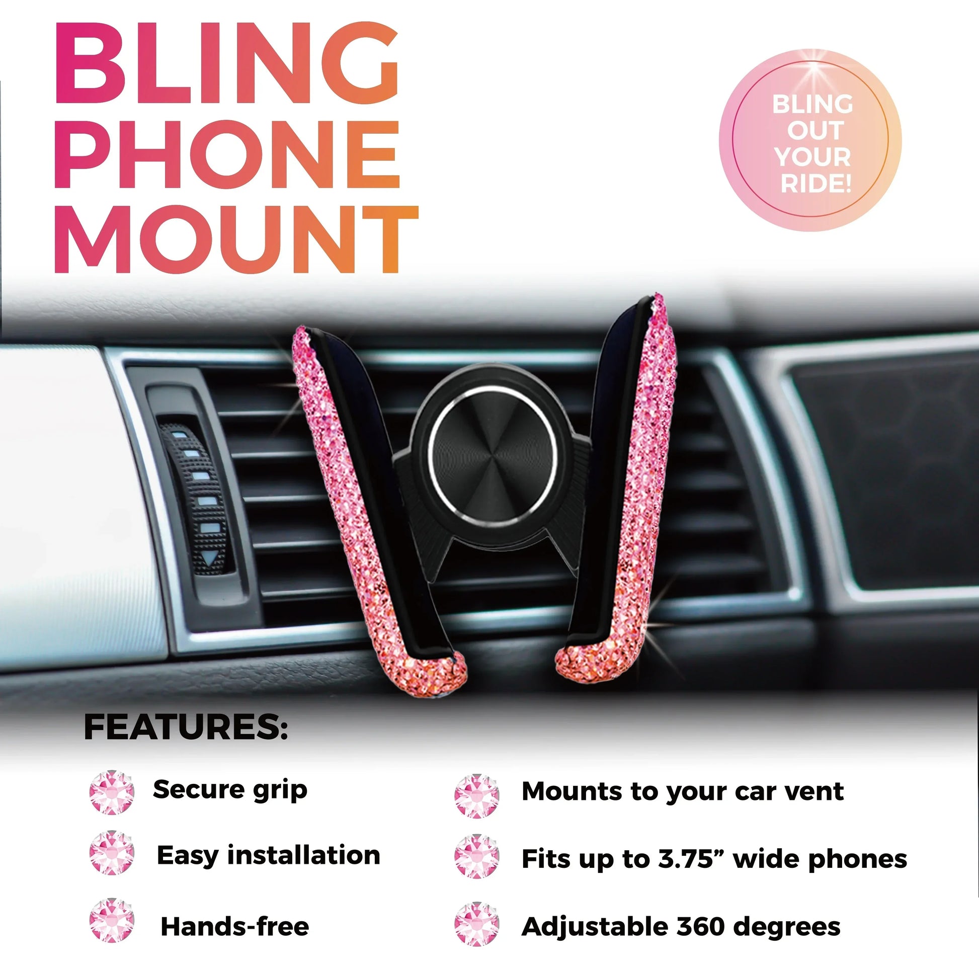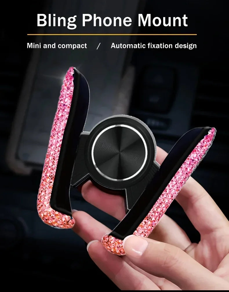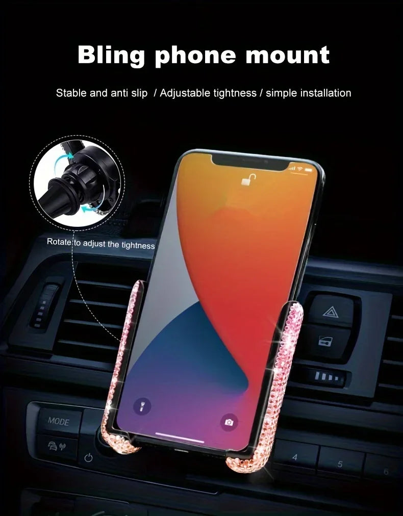 Tuo ripaus glamouria autosi sisustukseen. Tilaa timanttikoristeinen auton puhelinpidike ja nauti tyylikkäästä ja turvallisesta puhelimen säilytyksestä.