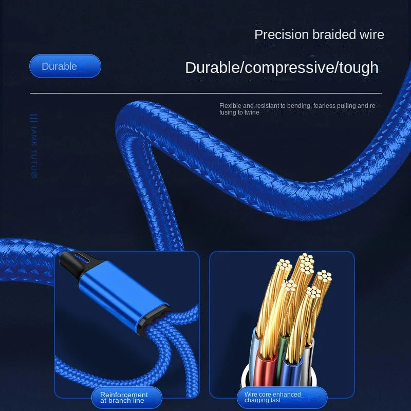 Yksi kaapeli, kolme liitäntää – lataa puhelimesi, tablettisi ja muut laitteet samanaikaisesti. Täydellinen perheelle, toimistoon tai matkalle. Säästä tilaa ja rahaa – ei tarvitse ostaa useita kaapeleita.