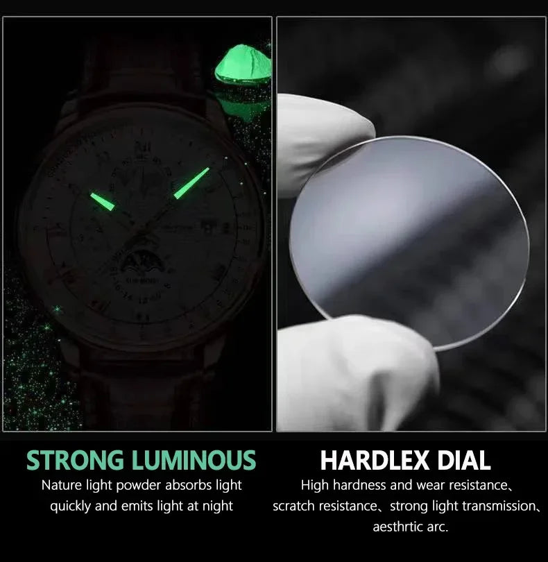 The moon phase display adds a romantic and classic feel to the watch - a rare feature in this price range. The Luminova illumination ensures that you can read the time effortlessly even in the dark. The genuine leather strap brings luxury and comfort to your wrist. The perfect gift for yourself or a loved one. Order now and experience a luxury watch at its best!