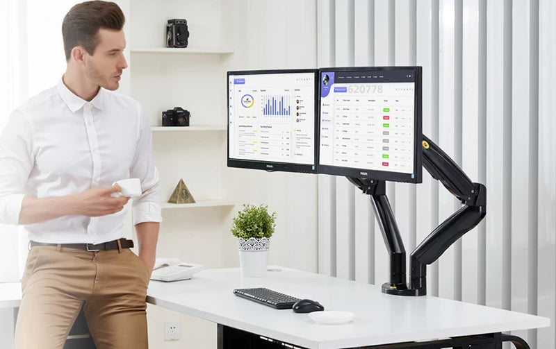 Paranna ergonomiaa, tuottavuutta ja työpisteen estetiikkaa. Investoi NB F195A kaksoisnäyttötelineeseen ja koe ero.