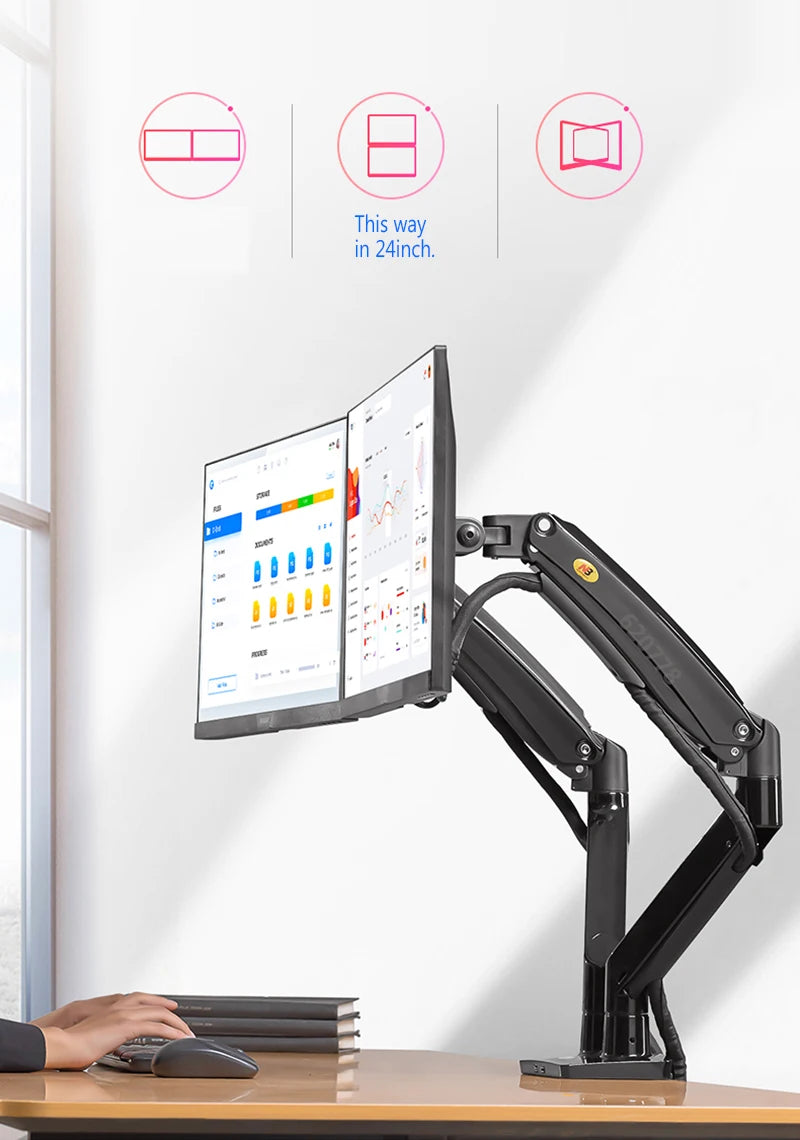 NB F195A on premium-luokan kaksoisnäyttöteline, joka mullistaa työpisteesi. Kaasujousitettu täyden liikkeen mekanismi mahdollistaa vaivattoman näyttöjen asemoinnin täydelliseen ergonomiseen asentoon – vähennä niska- ja hartiakipuja ja paranna keskittymistäsi.