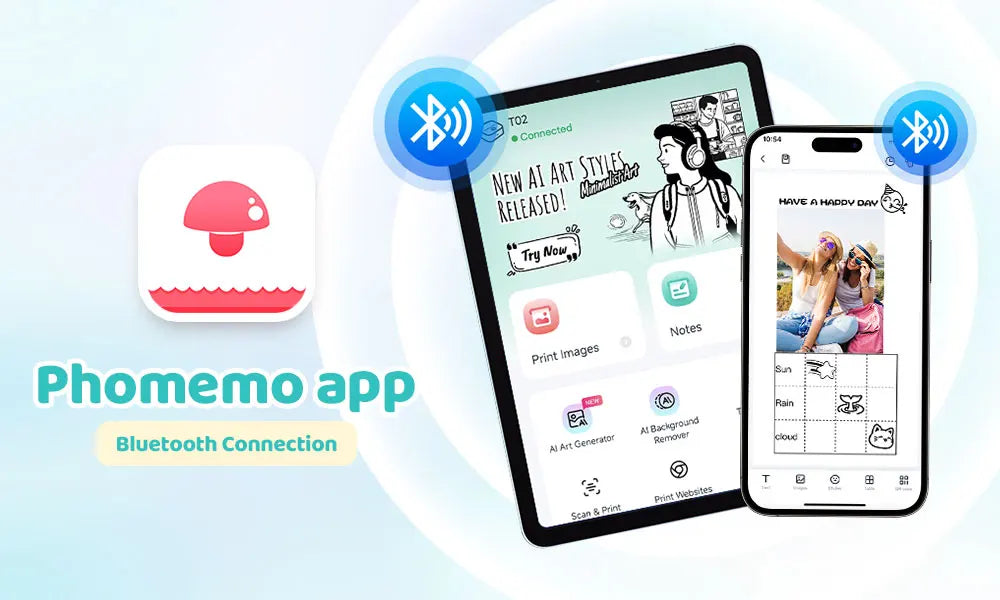 Connect the T02 Mini to your smartphone or tablet via Bluetooth and print directly without a computer. The free Phomemo app (iOS and Android) offers hundreds of ready-made templates, fonts and illustrations.