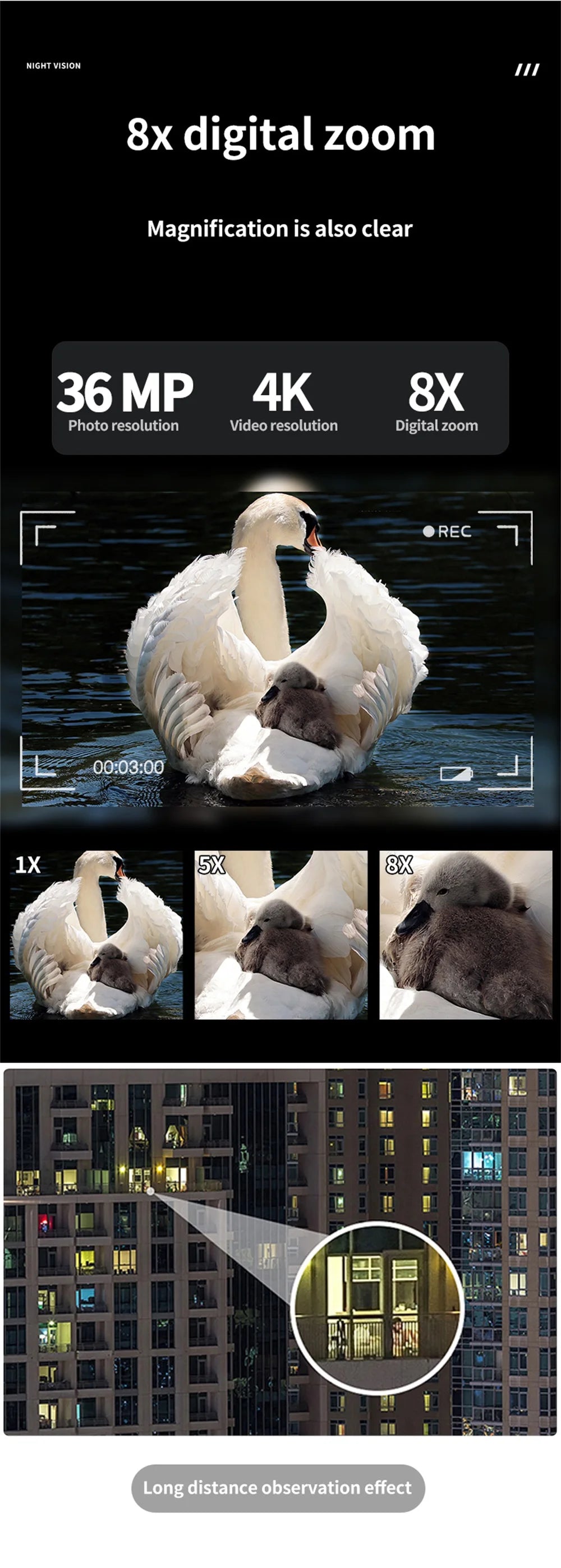Digitaalinen infrapunatekniologia mahdollistaa näkemisen täydellisessä pimeydessä ilman näkyvää valoa. 8x zoom tuo kohteet lähelle menettämättä kuvanlaatua. 4K UHD -tallennus varmistaa, että jokainen yksityiskohta tallennetaan tarkasti jälkikatsomista varten.