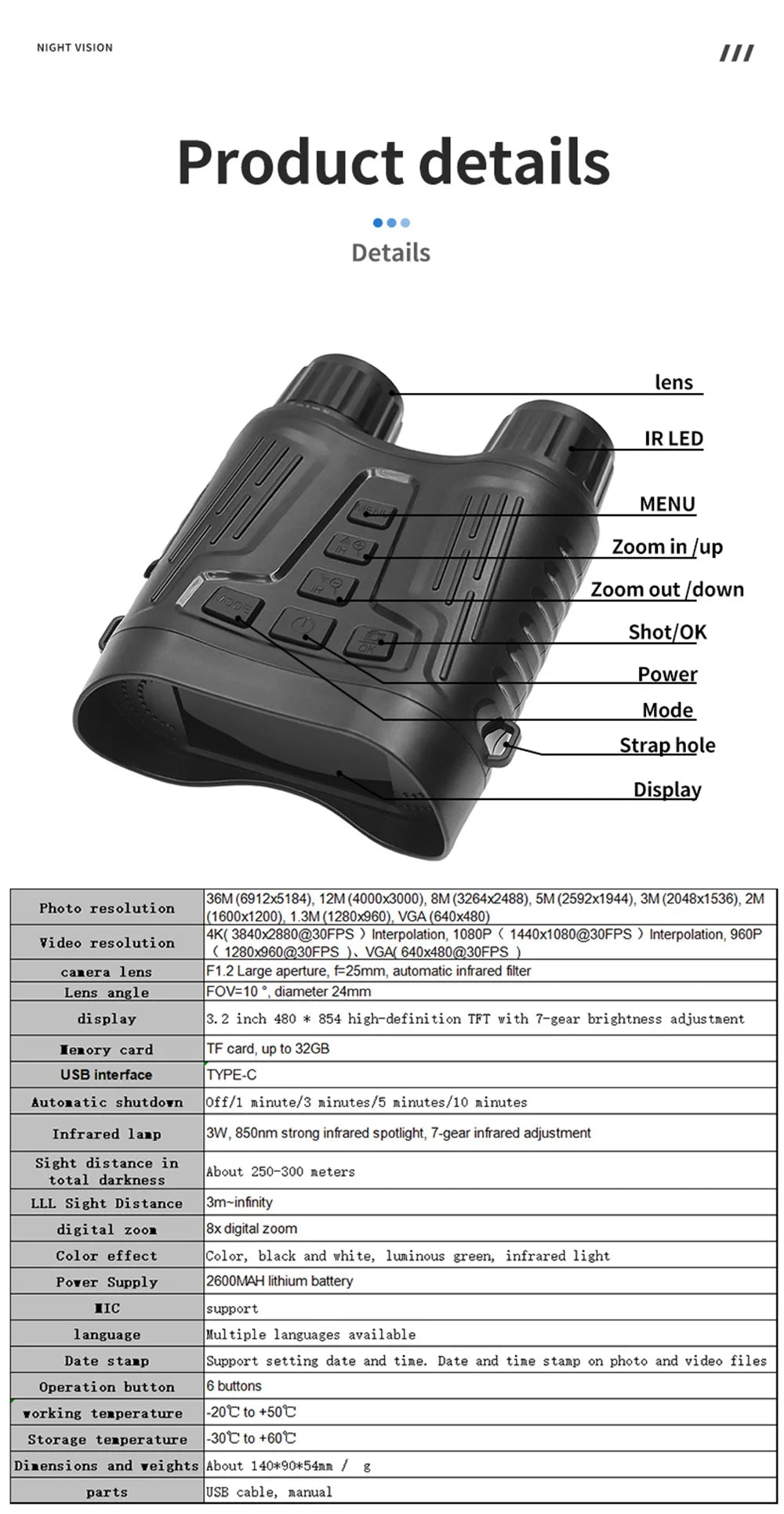 Ponbos NV2180 4K UHD Taktinen Yönäkökiikarit - 36MP Kamera, 8x Zoom, Infrapuna Metsästykseen ja Retkeilyyn