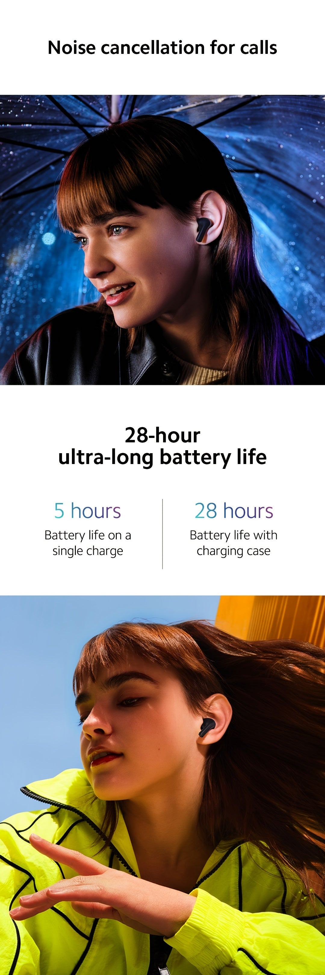The headphones offer up to 5-6 hours of listening time on a single charge, and the charging case allows for multiple additional charges. In total, you get up to 28 hours of use time - enough for a week of normal use without recharging!